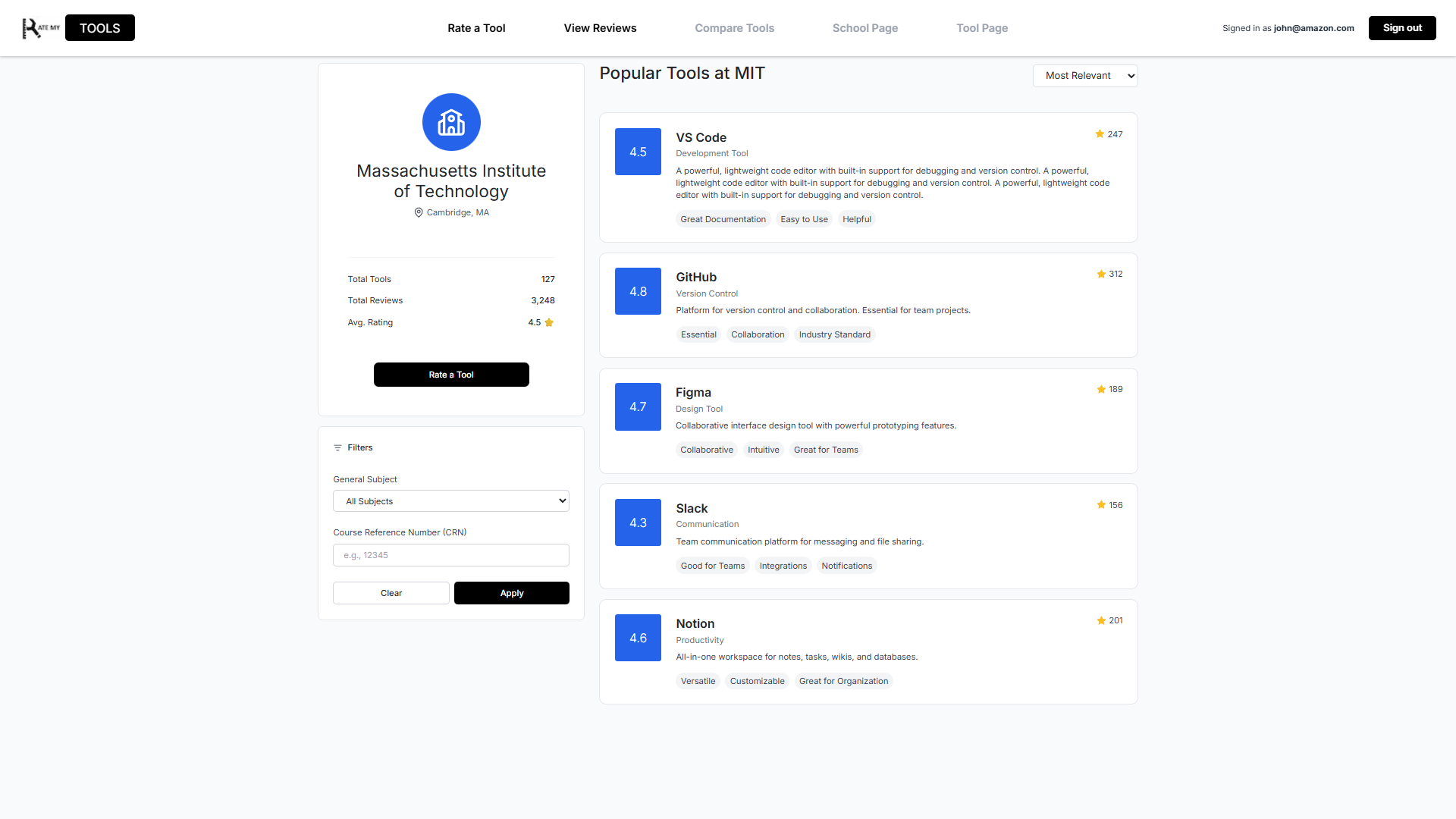 The school page was designed to provide users with a centralized view of what learning tools are being used and how they are rated at a specific institution. From this page, users can see a list of tools associated with the selected school, along with their overall ratings and review counts. This allows students to quickly understand which tools are most commonly used and which ones are viewed as the most helpful within that academic environment. It also features a filter option, where users can sort by course number or subject.